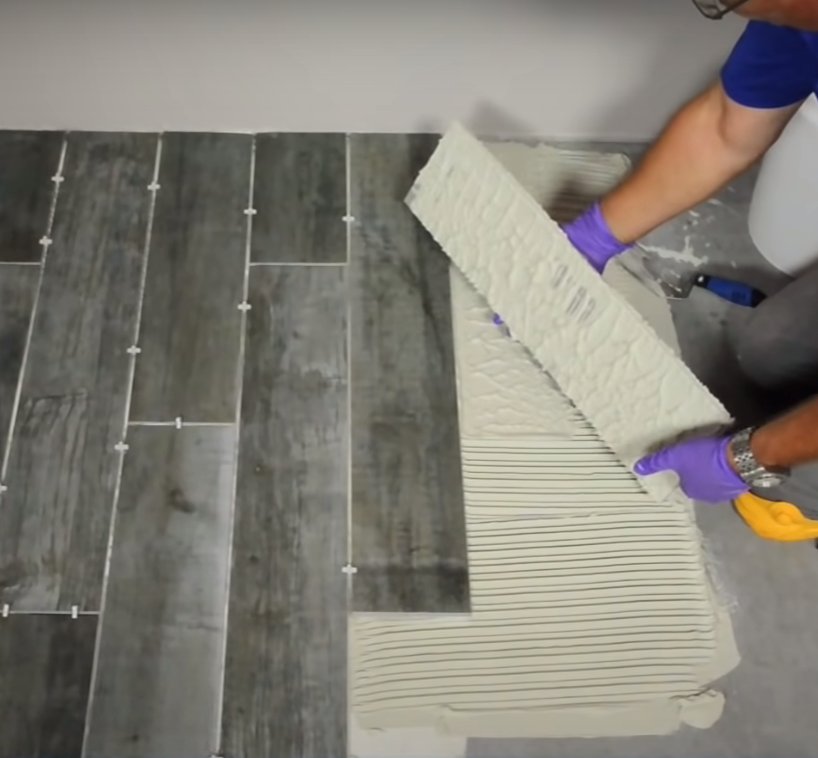 Bước 3: Sau khi keo đạt trạng thái “Xúc bay không chảy”, tiến hành đi keo. Phết keo đều ra các góc cạnh, sau đó dùng bay răng cưa cào lớp keo thành đường thẳng dài đều. Tạo đường mạch trên cả bề mặt gạch lẫn nền tường để tăng độ tiếp xúc. Làm cho gạch bám dính chắc hơn.